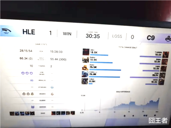 结果第一局比赛,之前狂虐GEN的C9,被齐装满员的HLE完全吊打。比赛第11分钟左右,HLE下路团打出2换4,此后HLE不断取得优势;比赛第17分钟左右,Zeus奥恩先手大空但Kanavi潘森进场帮助HLE打出0换3。此后HLE拉开七千经济差;比赛第20分钟左右,C9打出0换3拿下厄塔汗缩小劣势,但HLE迅速稳住局面;比赛第25分钟左右,HLE先后拉扯打出1换5团灭C9,随后拿下大龙;最终比赛第30分35秒,HLE抱团一波结束比赛。