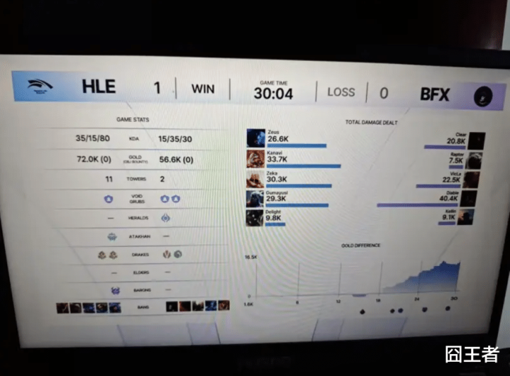 结果比赛被HLE打成了单方面的碾压局。比赛第14分钟左右,HLE在中路先手被反打,VicLa岩雀三杀帮助BFX先后打出0换4;比赛第18分钟左右,两队爆发小龙团。Kanavi奇亚娜完美先手,HLE一波打出1换5团灭BFX;比赛第22分钟左右,BFX在上路埋伏Zeus,Zeus雷克塞拖到支援后Kanavi奇亚娜带头反打,HLE打出1换5团灭BFX;比赛第25分钟左右,Gumayusi韦鲁斯砍下三杀帮助HLE打出1换4;最终比赛第30分04秒,HLE抱团一波结束比赛。